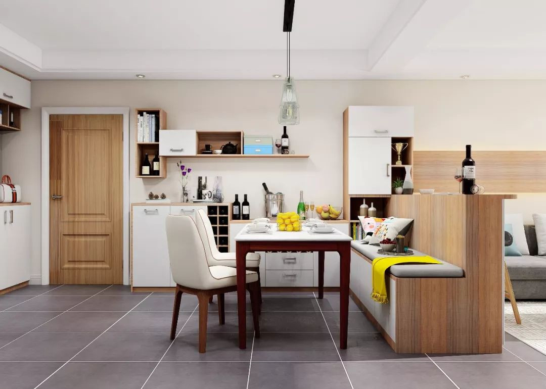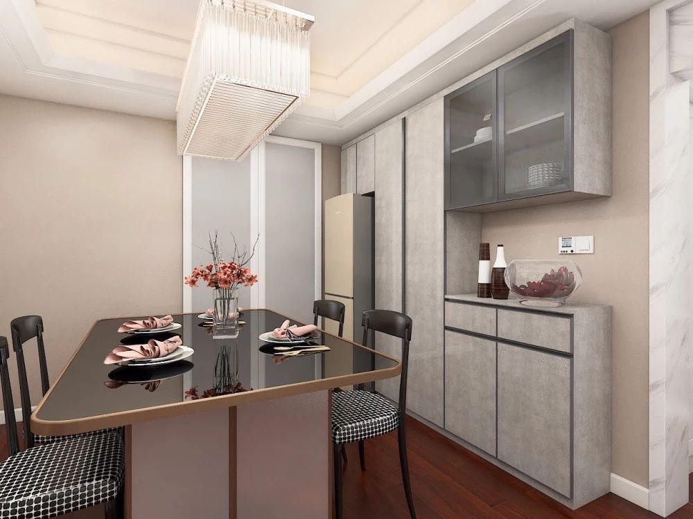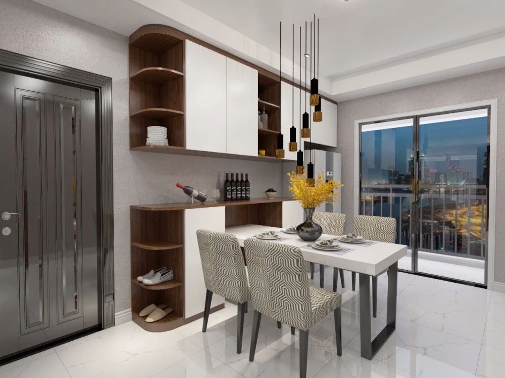 如果餐廳靠大門(mén),那正好把玄關(guān)也合并起來(lái)。充分利用墻體轉(zhuǎn)角空間,打造L型餐邊柜,靠門(mén)的那一面墻用作玄關(guān)。
