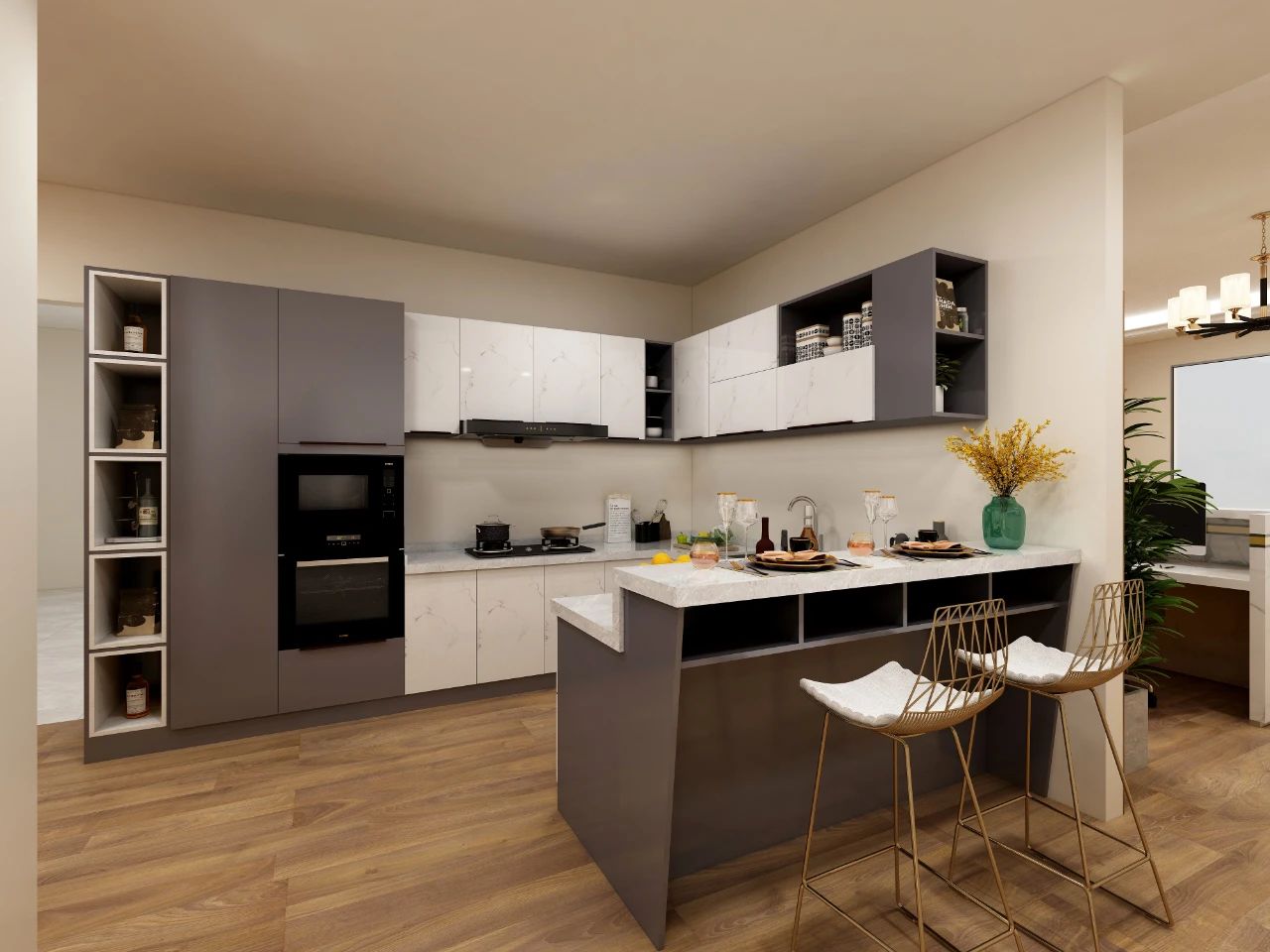 高級灰+高光魚肚白,封閉與開放格結合,精致的細節(jié)常常體現于色彩的呼應,在櫥柜的配件上,鋁師傅選用了銑型拉手,來實現顏值的進一步提升和柜內空間最大化。