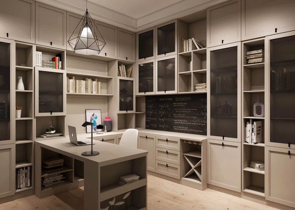 書桌和柜子的搭配非常關(guān)鍵,書桌的上方做玻璃柜,周邊也做儲(chǔ)物柜,這樣書房才能擁有更多的儲(chǔ)物空間,即使不工作的時(shí)候,也非常實(shí)用。