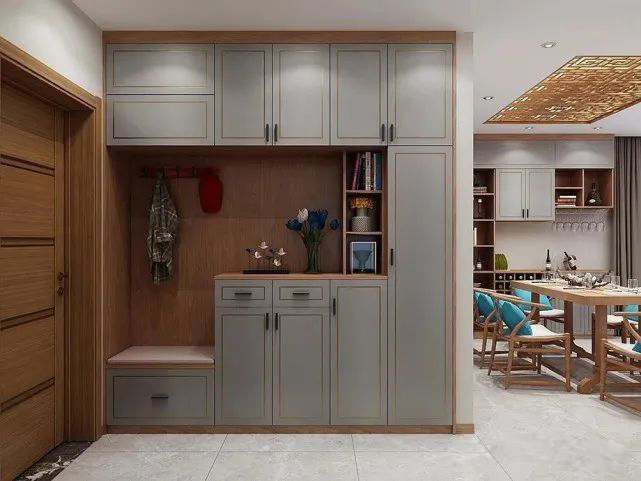 現(xiàn)在流行在一整面墻上把鞋柜和衣柜都做在一起,出入的外套和帽子都可以直接掛在上面,不用設(shè)置轉(zhuǎn)軸門,坐在換鞋凳上換完鞋,起身就能拿取,特別方便。