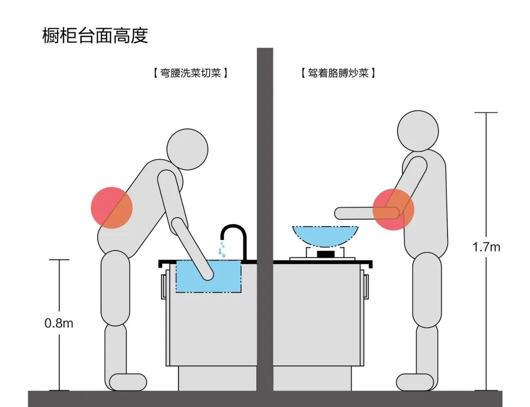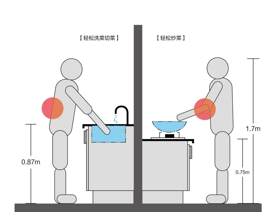 如果把廚房做成統(tǒng)一高度,那么洗菜時會因為水槽高度太低總是要彎腰,而灶具在灶臺之上,炒菜時總是要架著胳膊,時間一久,就會導(dǎo)致腰酸胳膊痛。
