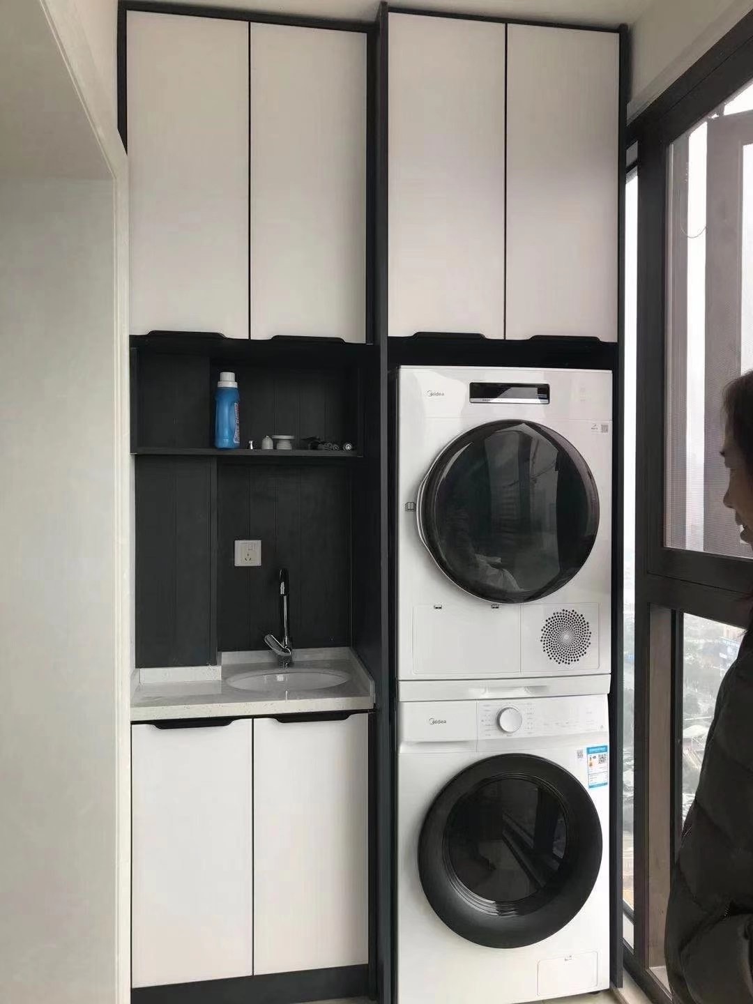 洗衣機,烘干機一起內(nèi)嵌到洗衣機里,這樣的全鋁陽臺洗衣機柜美觀實用。千萬要注意的是,將洗衣機放置在陽臺,一定要提前規(guī)劃好水管電路,預(yù)留好插座。洗衣機邊上的柜子一定要做好防水。