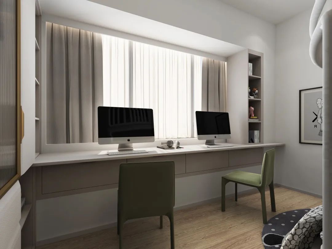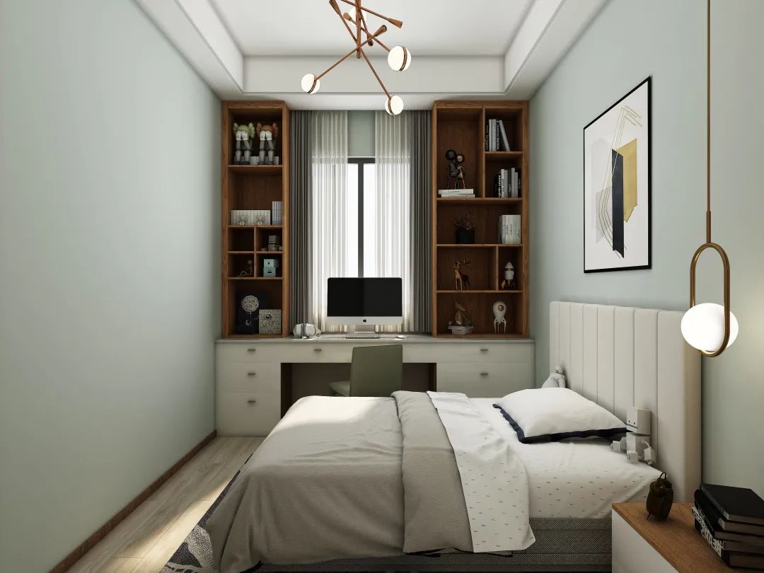 除了增加書桌臺(tái),飄窗兩邊也可以適當(dāng)?shù)脑O(shè)計(jì)展柜書柜,充分利用墻面空間擴(kuò)容收納。如果臥室實(shí)在太小,小到延伸書桌的空間都很難挪出來(lái),那不妨做一個(gè)折疊書桌。