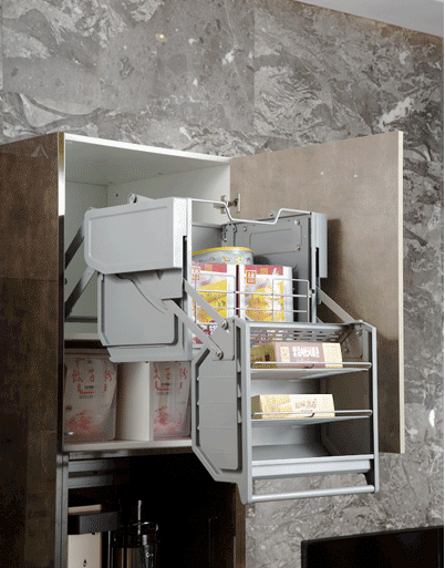 當(dāng)櫥柜遇到L型/U型布局時(shí),轉(zhuǎn)角空間很容易被浪費(fèi)。這時(shí)候,轉(zhuǎn)角拉籃了解一下,分分鐘體驗(yàn)感爆表。