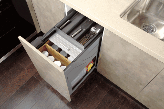 以往的地柜用兩層擱板就算完事,每次取物都好像在做“起立蹲下”,平白增加了不少勞動(dòng)量。于是就有了拉籃這個(gè)設(shè)計(jì),在收納功能強(qiáng)大的同時(shí)方便好用,除了貴點(diǎn)沒啥毛病。