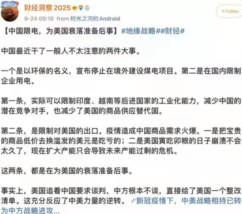 8、第二,限制中國產(chǎn)能,從而限制對美國的出口。因?yàn)橐咔橹螅M鈱χ袊唐返男枨髣≡?,但是把產(chǎn)能提上去,去換美國超發(fā)的貨幣是吃虧的。所以,限電是為了,降低產(chǎn)能,“唱衰美國”。