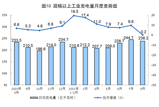 先來看一組數(shù)據(jù),在規(guī)模以上工業(yè)發(fā)電量月度走勢圖中,可以看到今年8月的日均發(fā)電量僅為238.2億千瓦時(shí)。